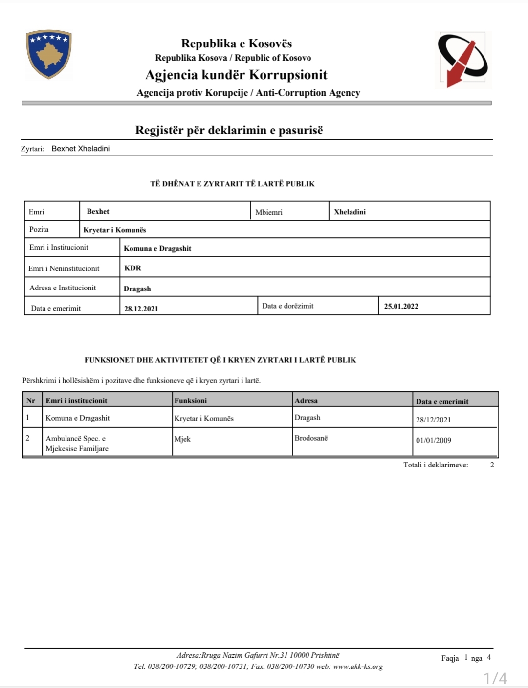 Më poshtë mund të gjeni linkun e plotë të zyrtarëve të Dragashit që kanë bërë deklarimit e pasurisë në AKK.