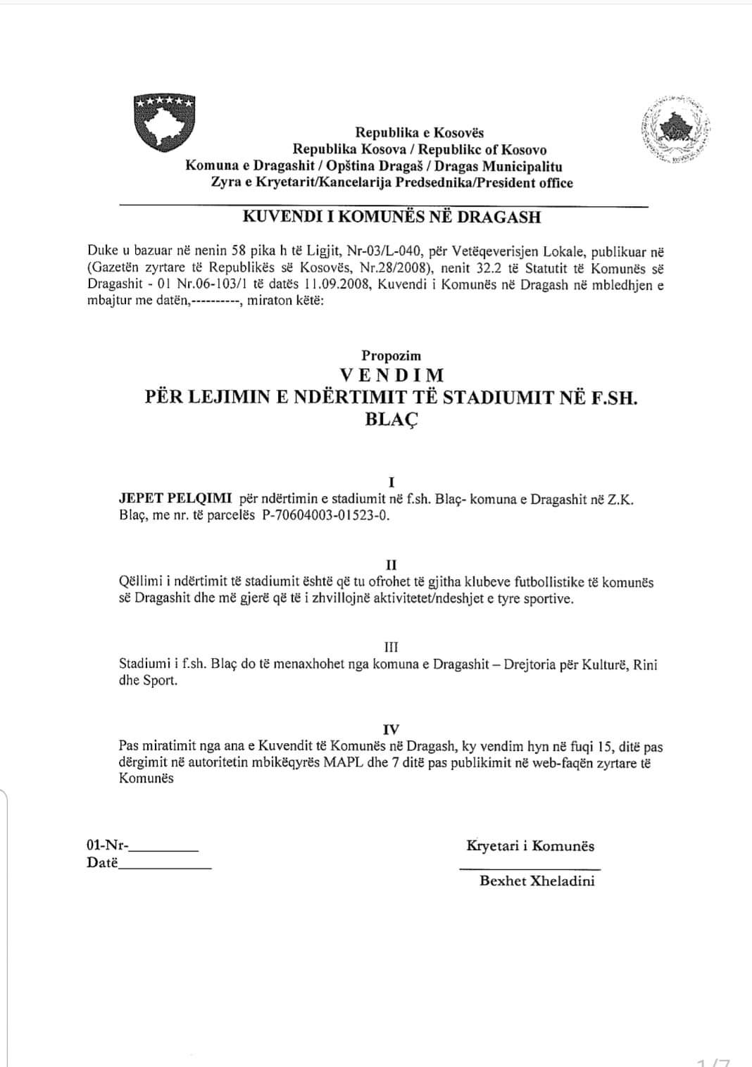Do të formojë një komision i cili do të merret me pregatitjen e dokumentacionit teknik në mënyrë që sa ma shpejt të jetë e mundur të fillojnë punimet për stadiumin e qytetit. Unë si kryetar i Komunës nuk shoh asgjë të keqe, që ne si komunë ti kemi dy stadiume, nji në Dragash dhe nji në Fshatin Blaç.